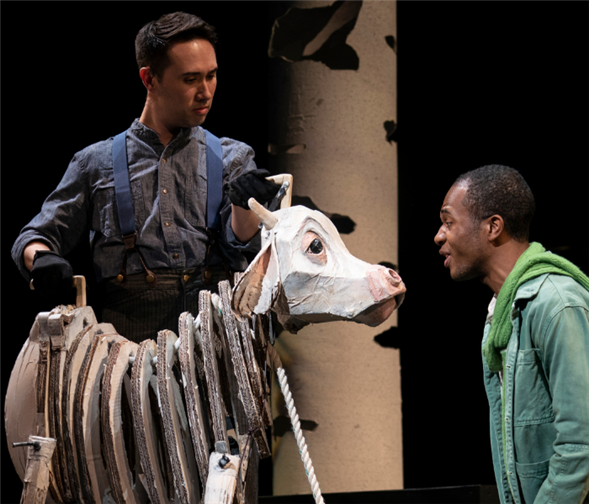 Top image: Kennedy Kanagawa, puppeteering Milky White, and Cole Thompson as Jack in the City Center Encores! production of Into the Woods, which has transferred to Broadway for a limited summer run. Photo by Joan Marcus
