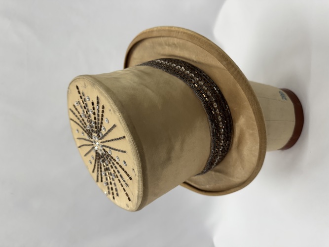 "We have ten hats by Theoni V. Aldredge from A Chorus Line, which opened on Broadway in 1975, so, like the TDF Costume Collection, it's celebrating a milestone anniversary. It was a groundbreaking musical that revolutionized the genre, much like the Collection did with costume rentals. Before we opened, most costume rental places were making things to have as part of their stock. We only rented donated items and used sliding-scale pricing instead of package shows. To me, A Chorus Line is emblematic of 1970s Broadway. Aldredge's initial costumes for the characters are iconic. She created a specific look for each dancer so that when they began to move around, you remembered who was who—one even wore a TKTS shirt. But in the end, when they put on the gold suits and hats, it's the complete opposite. She wanted them to all look the same. If you're a theatre lover and you see those gold hats, you know immediately what show they're from and you hear the 'One' vamp in your head."