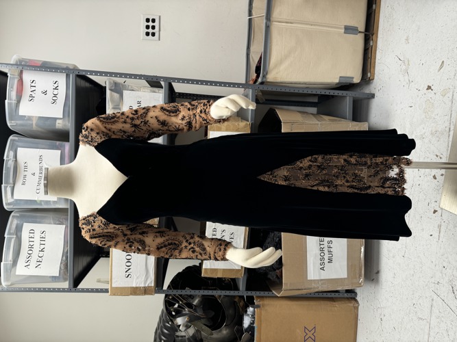 "For the 1990s, I thought about highlighting Rent or Disney's first Broadway musical Beauty and the Beast. But I chose a piece from Jelly's Last Jam because that show is so important to the Collection. The costumes for this 1992 musical were designed by Toni-Leslie James—it was her first Broadway credit! The show was about Jelly Roll Morton and explored the origins of jazz and how it is deeply rooted in the African-American experience. I loved the designs because they went from the Reconstruction Era to the early 1940s, and then there was the whole aspect of Jelly being in a kind of limbo. So Toni had to come up with all of that. The costumes were donated soon after the show closed. We received everything: hats, shoes, every single piece. Fifty to 60% of the items are still in stock to rent. They were really well made! And they go out all the time. Even Toni has periodically come back to rent her own pieces from this show. This dress is from when Phylicia Rashad went in as a replacement for original star Tonya Pinkins."