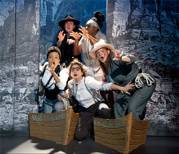 That spirit echoes through the show. The plot, for instance, is inspired by the Powell Geographic Expedition of 1869, when an American naturalist named John Powell led white men into the Grand Canyon for the first time. Yet in this production, all the men are played by women. They also use contemporary slang and generally behave like modern Americans.