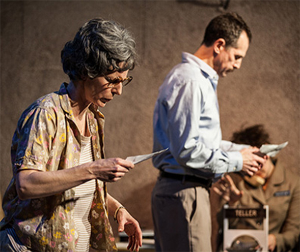 Moreover, because June is deaf, she's always leaning in to hear. "We've created a movement score that exaggerates that leaning in," says Dement. Playwright Masciotti describes this physical score as "formalized movements that lift the scenes out of the very real, gritty world that they are based in." To that end, the goal in <i>Social Security</i> isn't to convince the audience that Dement is actually 80 or to create pure naturalism. "We made no attempt to be literal," Masciotti says. "We tried to add meaning to the text with our choices, rather than restrict out choices to the world of the text."