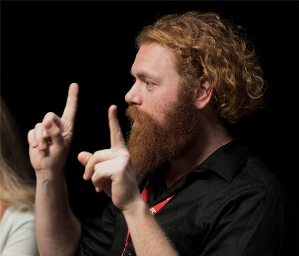 JW Guido, a Deaf actor and Artistic Director of the 36-year-old NY Deaf Theatre, spoke to the lack of opportunities he found as a Deaf actor growing up. With a mission entitled "Deaf by Deaf for Deaf," Guido described his company's goal of displaying Deaf talent across all realms of theatre – both onstage and backstage. He agreed with other speakers about the time-consuming process of preparing slides used for captioning, and he hoped for a way to make the process of captioning a more artistic one. (At this and all other presentations, Candace Broecker-Penn and Dylan Geil were both on hand as ASL interpreters.)