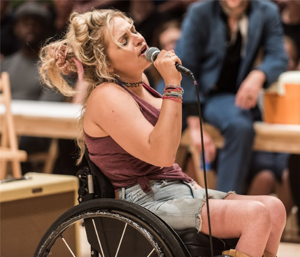 That's exactly what Fish did when he picked Stroker for Ado Annie. Her disability is never commented on during the show, just accommodated with tweaked choreography and costars who assist when necessary -- she gets swept up in a few different men's arms. But to get her on stage, big adjustments had to be made to the theatre.