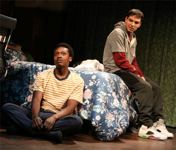 Top image: Ato Blankson-Wood and Juan Castano in Transfers. Photos by Joan Marcus.