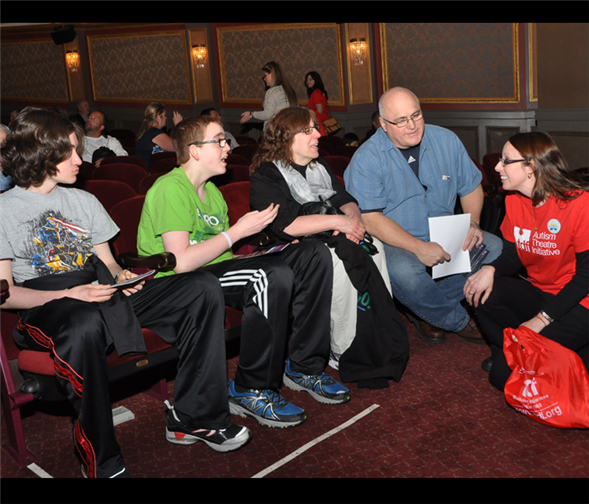 Photos courtesy of TDF's Accessibility Programs. Top photo: A volunteer talks to the audience during an autism-friendly performance.