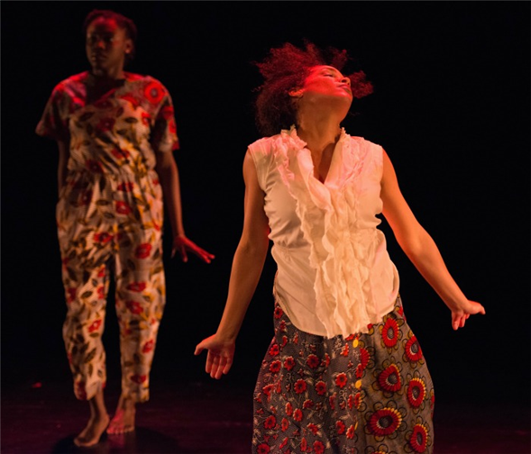 I can't shake the images and emotions sparked by the works I saw that night. In #SayHerName, prison bars separated Vershawn Sanders Ward from the audience. More than the orange jumpsuit, the confinement of her movements signified her captivity: hunched and low, hands invisibly cuffed behind her head. Audio channeled activists Angela Davis, Assata Shakur, and the late Sandra Bland, who died in jail after a traffic stop. Ward's frame conjured the bondage of black female bodies, literal and figurative. Native Portals: Continuum of Action (Witness) + Release greeted the audience with a noose dangling center stage. Kente cloth, floor-sweeping floral skirts, and white headbands transformed Lela Aisha Jones and her FlyGround ensemble into enduring symbols of black female suffering and strength. Visibly pregnant, dancer Peaches Jones moved within the ropes, as if trying the noose on for size. A recording of community organizer Deray McKesson's voice floated over the dancers as he argued with CNN's Wolf Blitzer about the damage caused during the Baltimore protests over Freddie Gray, who died in police custody. "I know that Freddie Gray will never be back and that those windows will be."