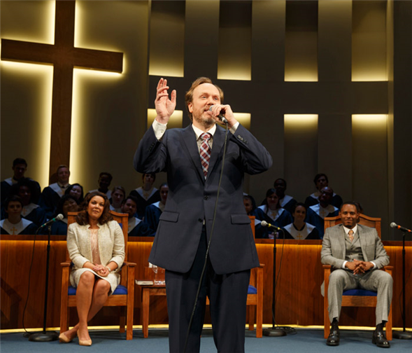 Photos by Joan Marcus. Top photo: Andrew Garman (foreground) as Pastor Paul. Seated L to R: Linda Powell, Larry Powell, and Philip Kerr.