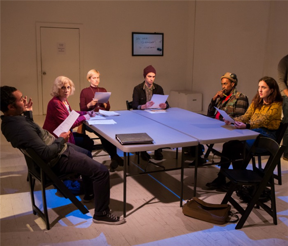 But even though In the Room is a play about writing a play, and takes place in a white-walled space filled with chairs and long tables, it is not a dull affair. It contains colorful characters who are an amalgamation of people that Dial encountered in his own courses. After attending so many of them, he realized there were two types of people he saw most often: "I think there are playwrights who want to do playwriting as a career and they know that and they're sitting down thinking, 'I want to do this, I'll probably go to grad school and I want to pursue this as my life,'" he says. "Then there are the people who start out and think, 'I'm going to try this out and see if this is something that's for me. I've always wanted to write a play and this will keep me on a deadline and help me do that.'"