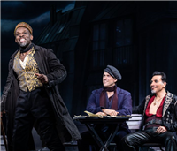 Once the Insta-orgy dies down, director Alex Timbers (late of Beetlejuice) draws us into the action instantly with the irresistible French-tinged anthem “Lady Marmalade.” If you’re a fan of Luhrmann’s movie, you’ll surely recall the chart-topping soundtrack cover by Christina Aguilera, Lil’ Kim, Mya, and Pink. If you don’t know the film, you might remember Patti LaBelle singing the original disco-funk version and the then-controversial lyric “Voulez-vous coucher avec moi ce soir.” This is our welcome to the Moulin Rouge: It’s where “sparkling diamond” Satine descends from the ceiling to perform; it’s where Christian first glimpses and falls desperately in love with her; it’s where the Duke of Monroth (Tam Mutu) decides he must possess her; it’s where painter Toulouse-Lautrec (Sahr Ngaujah), Christian, and tango dancer Santiago (Ricky Rojas) plan to produce their Bohemian Rhapsody. And it’s all presided over by ringmaster/emcee Harold Zidler (six-time Tony nominee and character actor extraordinaire Danny Burstein): “Welcome, you gorgeous collection of reprobates and rascals, artistes and arrivistes, soubrettes and sodomites,” he proclaims with a deliciously lewd grin.
